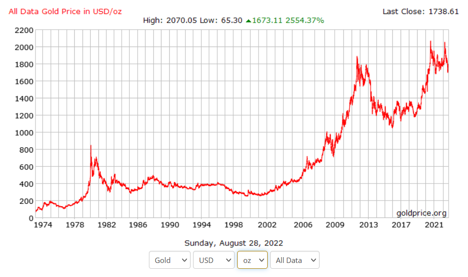 위 그래프는 1974년부터 금의 가격을 나타낸 것입니다. 우상향하고 있는 모습이 보이실까요?