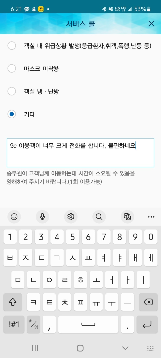 저렇게 민원사항에 대한 내용을 써주시고 민원을 넣으면 승무원 분께서 오셔서 조치를 해주십니다.