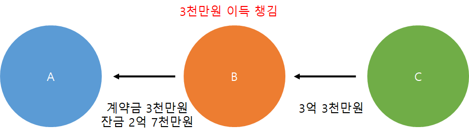 결국 B와 C가 매매계약을 하고 C에게 3억 3천만원을 받아 A에게 2억 7천만원을 건냅니다. 여기서 B는 가운데서 3천만원이라는 이득을 가지게 됩니다. 3억에 산걸 3억 3천만원에 팔았으니까요.