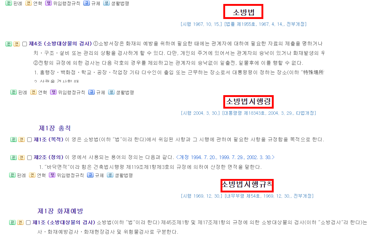 즉, 소방법 > 소방법 시행령 > 소방법 시행규칙으로 3단계로 이뤄져 있다고 이해하시면 되겠습니다.