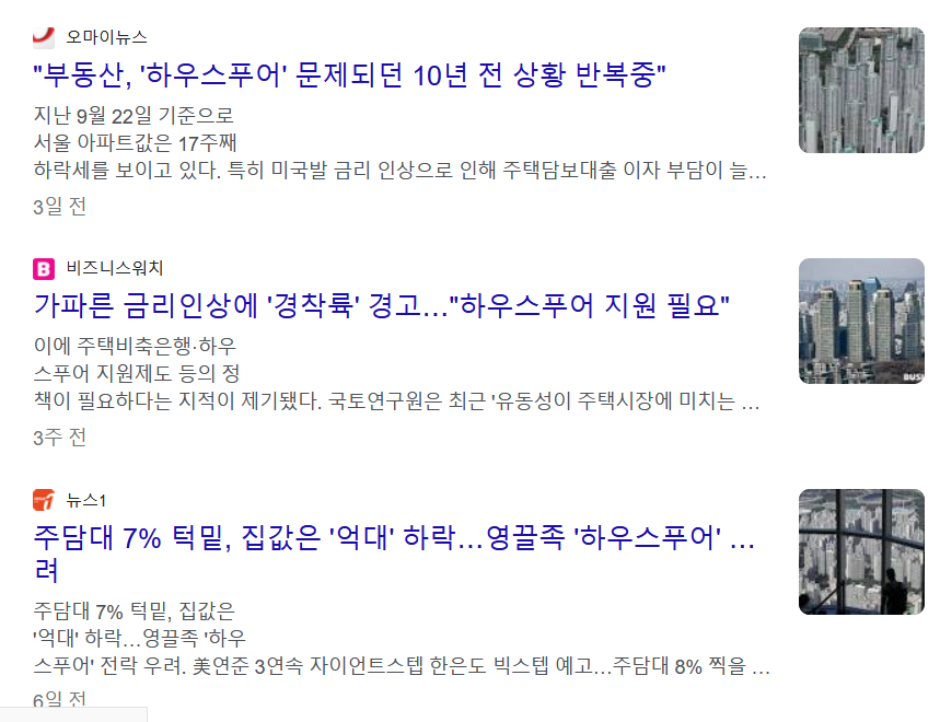 결국, 대출금리 상승압박과 주택가격 하락으로 당장 내 지갑에서 돈도 빠져나가는데 내가 산 집의 가격도 빠지면서 손해가 엄청나게 됩니다. 이것이 하우스푸어가 되는 원리입니다.