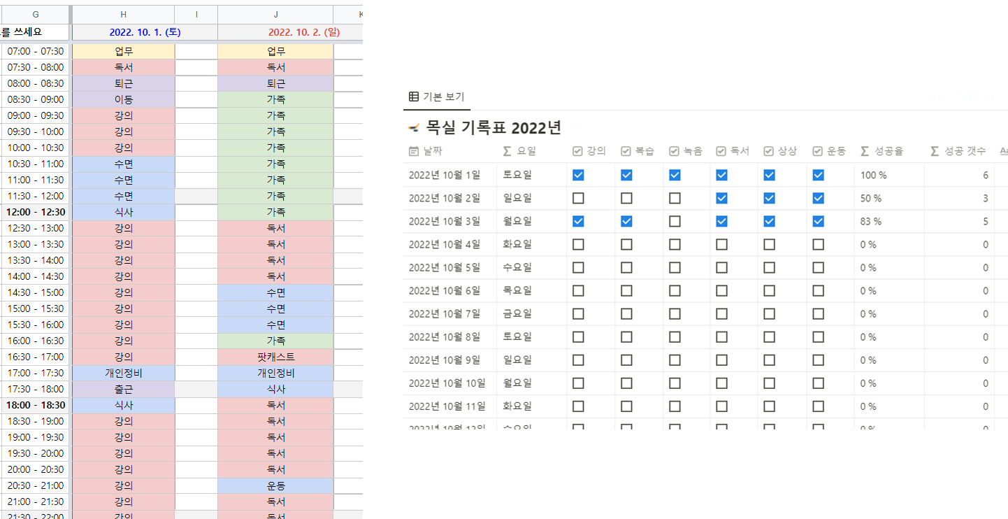 그래서 저는 구글 스프레드시트와 노션(Notion)을 활용해 제가 보낸 오늘 하루를 기록하고 있습니다. 기록을 해야 내가 어떻게 시간을 보냈는지 알 수 있고, 내가 한달을 어떻게 보냈는지 알 수 있습니다. 이를 통해 지난 한달을 반성합니다. 잘한 점은 스스로에게 칭찬하고 보상을 주고 못한 점은 다음에 더 잘하자고 격려합니다.