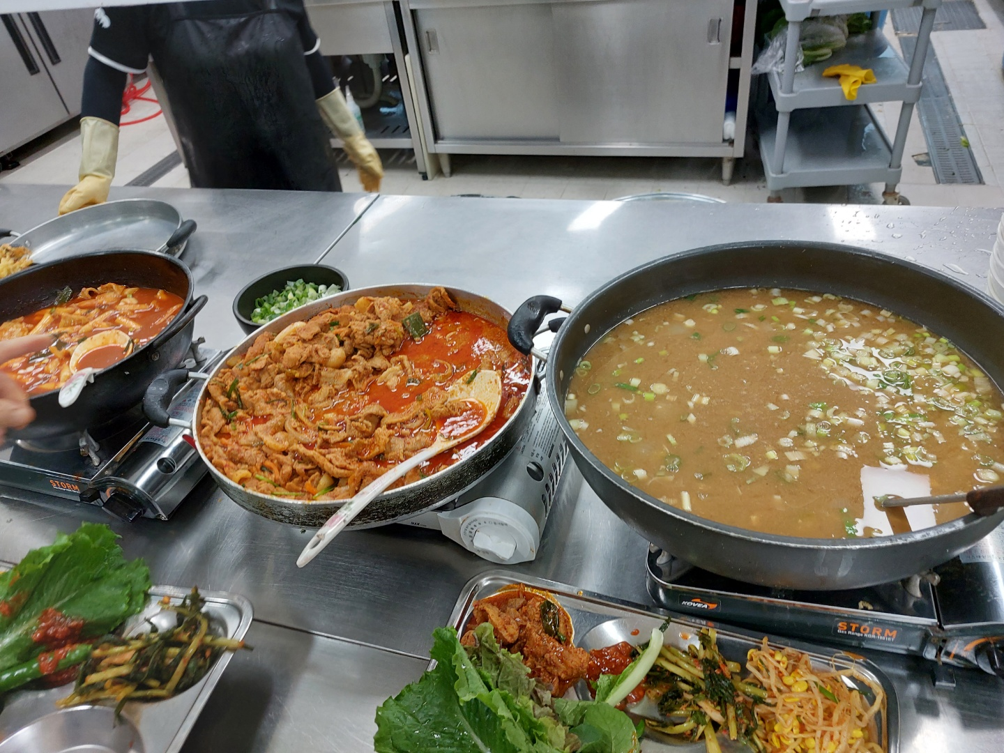 메뉴는 기본 밥과 국에다가 몇가지 반찬류들 쌈, 쌈장, 제육볶음, 누룽지까지 있습니다. 후식까지 완벽합니다. 오랜만에 제대로 맛있게 식사했습니다.