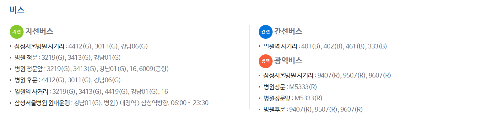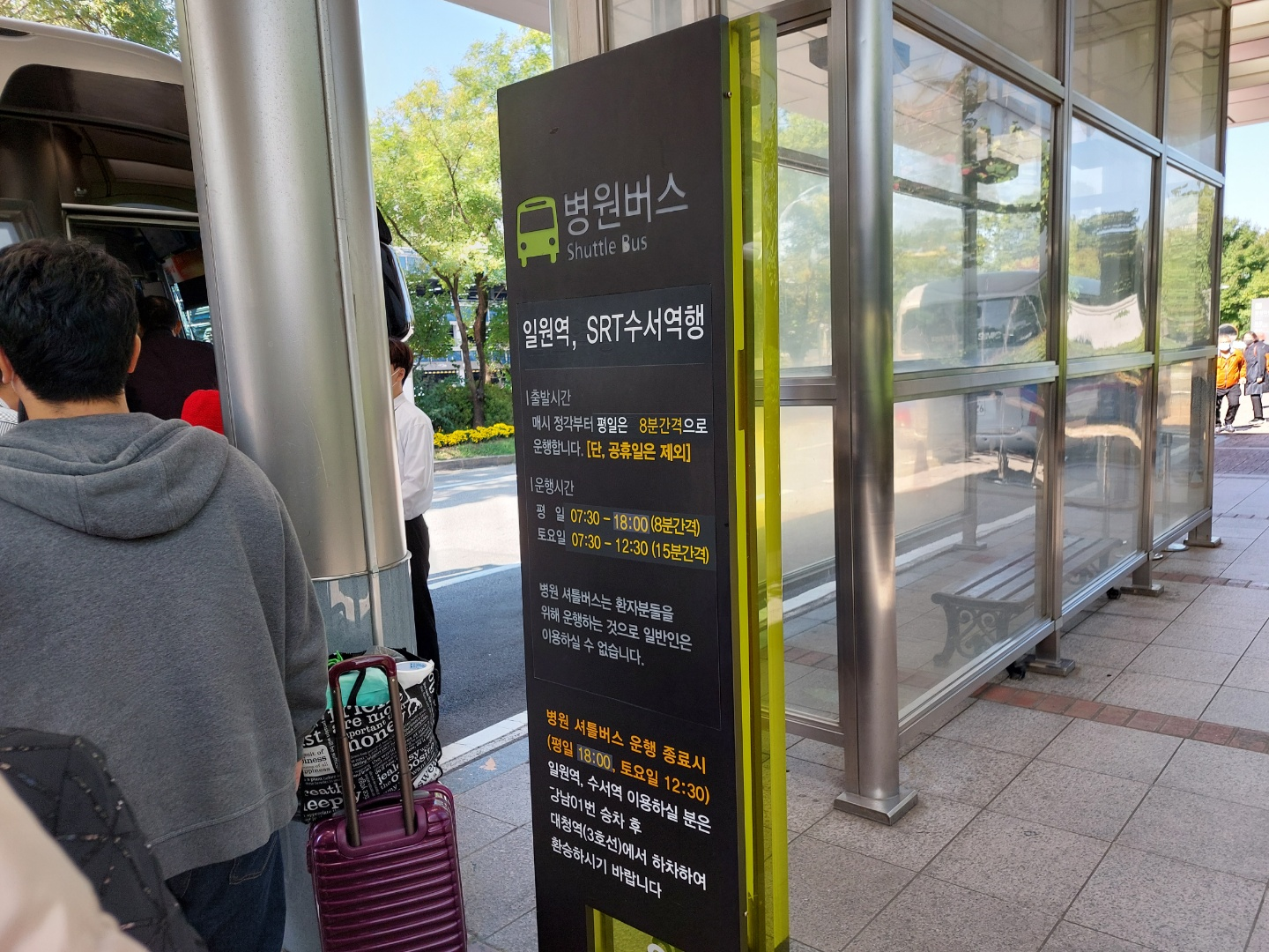 지하철역에서 삼성서울병원 가실때는 일원역 1번 출구, 수서역 1번 및 3번 출구에서 셔틀버스를 탑승하시는 걸 추천드립니다. 어디서 타도 결국 병원으로 가지만, 일원역 7번 출구에서 셔틀버스를 타면 수서역을 거쳐 병원으로 가기 때문입니다.
