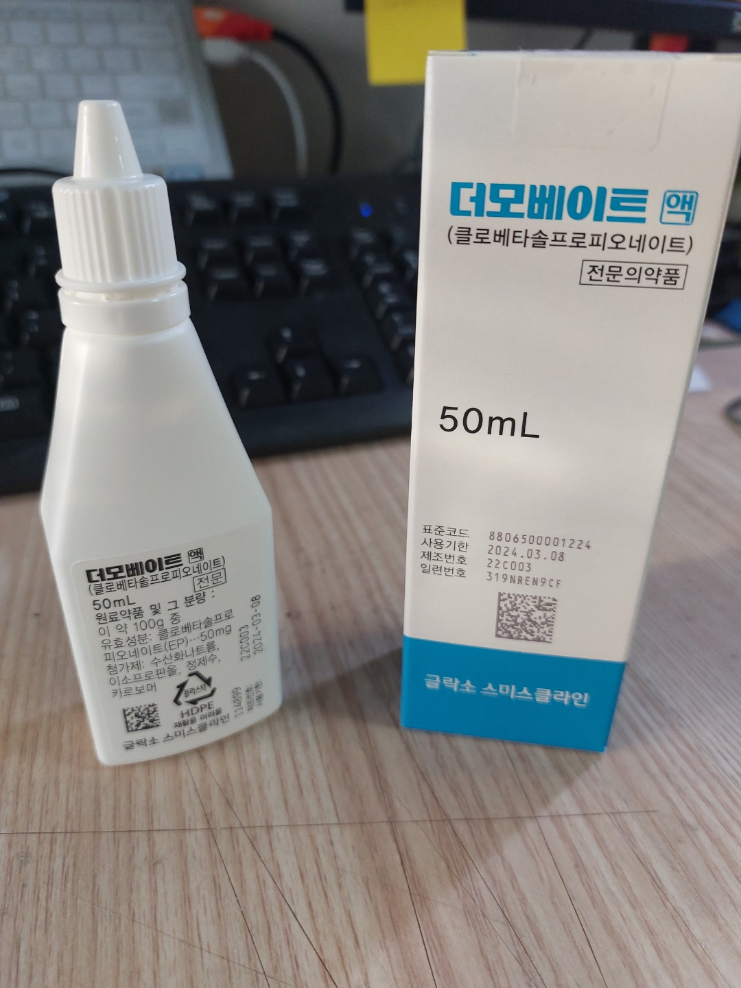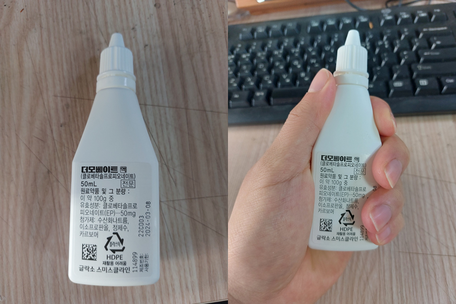 저는 더모베이트 50ml 액을 쓰고 있습니다. 25ml, 50ml 두 종류가 있는 것으로 알고 있습니다.