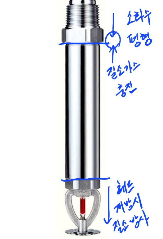 소방시설관리사인 지인분(알려주셔서 감사합니다)께서 드라이펜던트가 꼭 ㄷ자로 시공해야만 하는 것은 아니라고 합니다. 일반 하향식 헤드처럼 설치되어 있는데 헤드 목 부분에 질소가스가 충진되어 있어 소화수가 차지 않게됩니다. 화재시 감열체가 작동하면서 질소가스가 분출되고 질소가스 압력과 평형을 이루고 있던 상부 노즐측에서도 소화수가 분출되고 헤드로 소화수가 방사되게 됩니다.