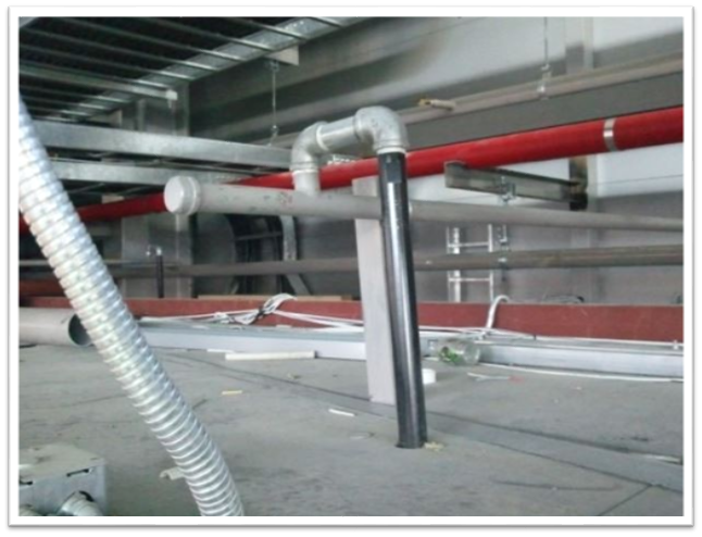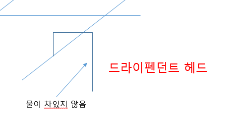 하지만 드라이펜던트 헤드의 경우에는 길쭉한 구조 때문에 위 그림처럼 ㄷ자 형태로 설치를 해야합니다. 저렇게 시공을 하게 되면 물이 차있지 않게 됩니다. 그러면 온도가 영하이하로 내려가도 물이 없기 때문에 동결우려가 없게 됩니다. 그래서 화재시에도 스프링클러가 정상적으로 작동할 수 있게 됩니다.