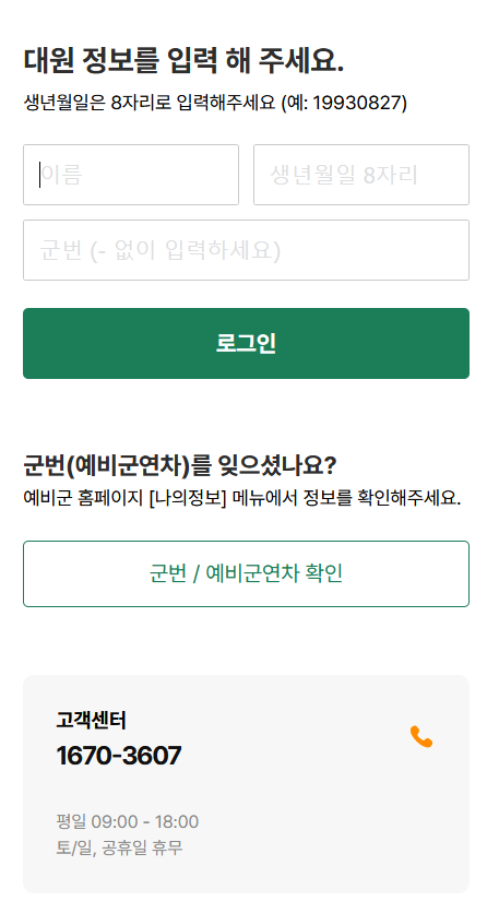 교육시작을 클릭해주시고 이름, 생년월일, 군번을 입력합니다. 군번 기억하느라 시간이 좀 걸렸네요.