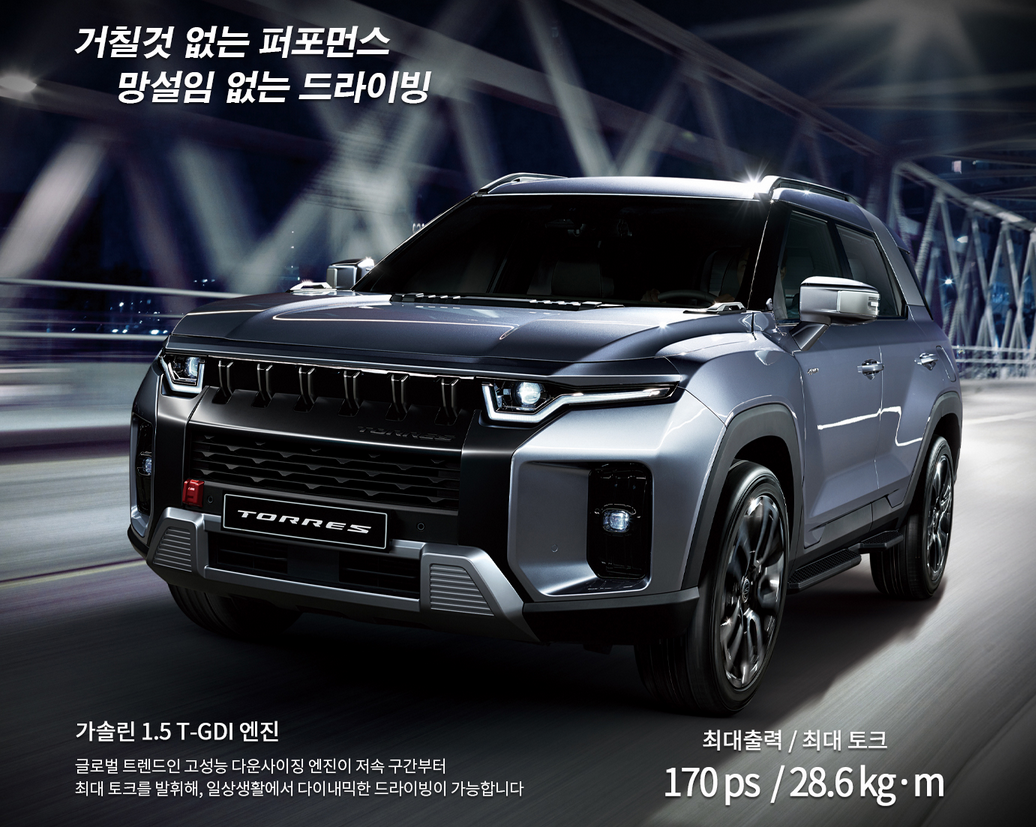 쌍용 토레스는 중형 SUV인데도 친환경 정책에 맞춰 가솔린 모델만 출시하였습니다. 쌍용 토레스의 경쟁 모델인 현대 싼타페, 기아 쏘렌토, 르노코리아 QM6는 디젤 모델도 있습니다. 차별화를 두기위한 쌍용자동차의 전략이 아닐까 생각합니다.