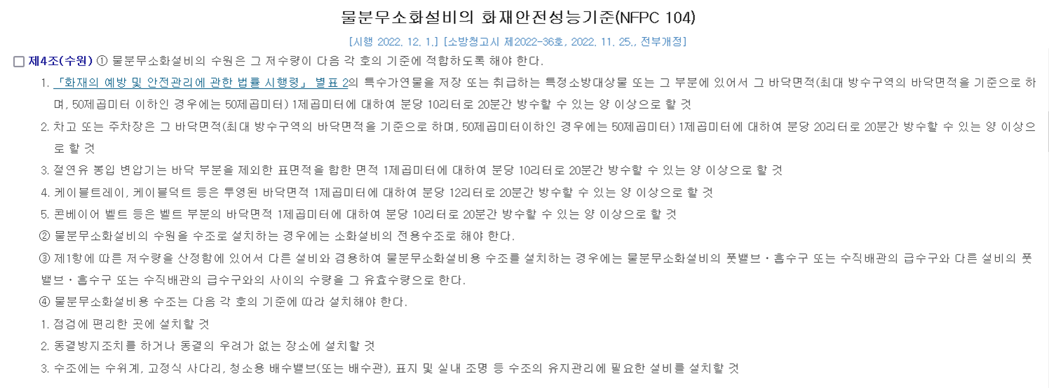 현재는 폐지된 소방기술기준에관한규칙에 위험물저장탱크에 설치해야 하는 물분무설비 수원 기준이 있다. 소방기술기준에관한규칙은 폐지된 법안으로 현재는 화재안전성능기준을 보아야 한다. 다만, 물분무소화설비의 화재안전성능기준(NFPC 104)에는 위험물저장탱크에 설치하는 물분무설비 수원의 양에 대한 기준이 없다. 왜 없는지는 좀 더 찾아봐야겠다.