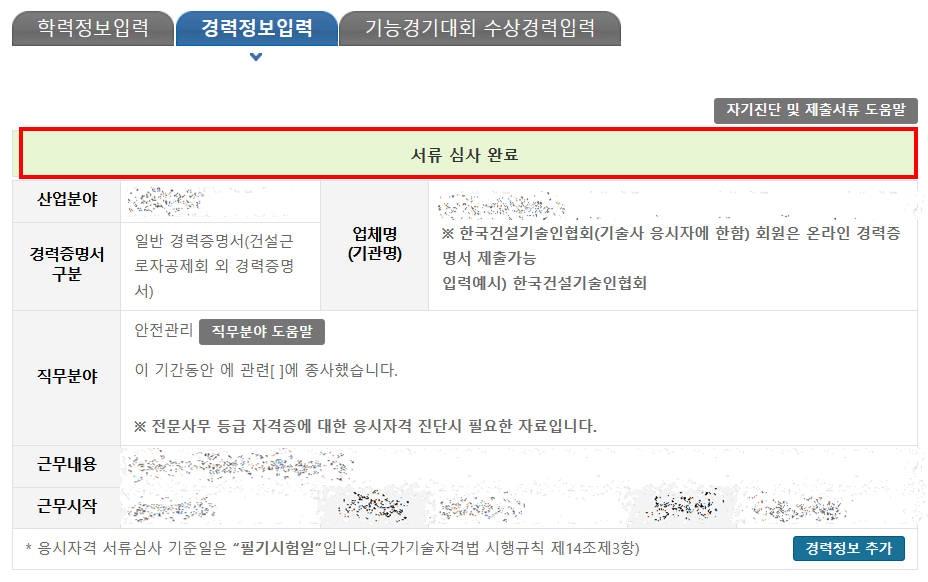 학력/경력수정에서도 확인이 가능하다. 경력정보입력을 누르면 내가 제출했던 경력증명서 정보가 담긴 칸이 생긴다. 그리고 위에 서류 심사 완료라고 뜬다. 서류 심사가 되지 않으면 서류 심사 이전이라고 뜨고 붉은색으로 표시된다. 초록색이 나오면 내 경력증명서가 승인되었구나라고 생각하면 된다.