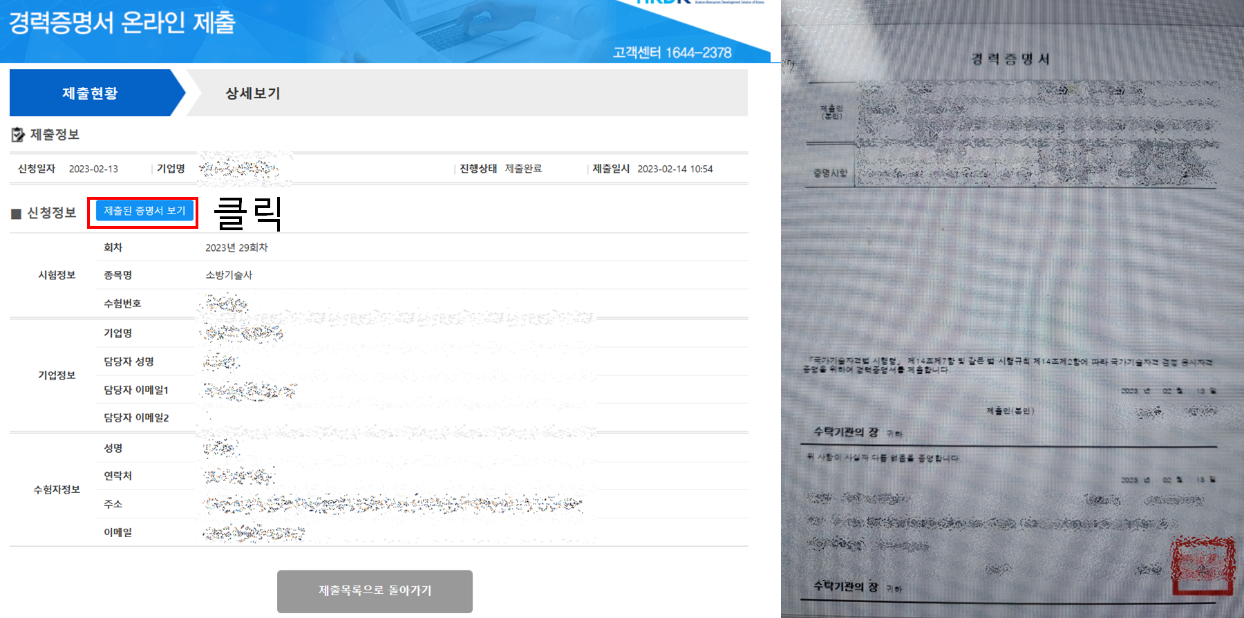 이거는 온라인으로 경력증명서를 제출했던 분들에게 해당되는 부분이다. 제출현황 - 상세보기를 누르면 내가 온라인으로 경력증명서를 제출할 때 입력했던 정보들이 나온다. 기업담당자가 제출을 해주면 '제출된 증명서 보기'라는 파란색 버튼이 생긴다. 이걸 누르면 기업담당자가 입력해준 경력증명서를 볼 수 있다. 개인정보가 담긴 서류라 컴퓨터 캡처는 불가능해서 사진을 찍었다.