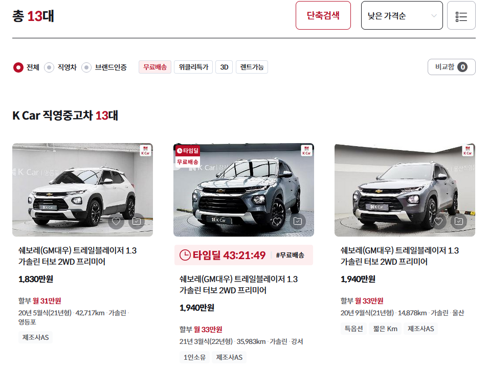 이상으로 쉐보레 트레일블레이저 페이스리프트 자동차세를 알아보았습니다. 쉐보레의 소형 SUV인 쉐보레 트랙스 풀체인지도 23년 출시예정입니다. 같은 쉐보레에다가 같은 소형 SUV라 포지션이 겹칩니다. 오히려 소비자의 선택권이 넓어져 판매량에 좋은 영향을 줄 수도 있지만 소형 SUV를 2대나 출시하면 생산 비용이 커지지 않을까 싶습니다. 쉐보레 트레일블레이저는 국내 소형 SUV 점유율 10%로 쉐보레 치고는 엄청난 판매량을 보여주고 있습니다. 쉐보레의 효자 품목입니다. 케이카에서 중고차로도 괜찮은 가격에 판매하고 있습니다. 이번 페이스리프트로 트레일블레이저 판매량이 더 개선될지는 두고 봐야겠습니다. 감사합니다.