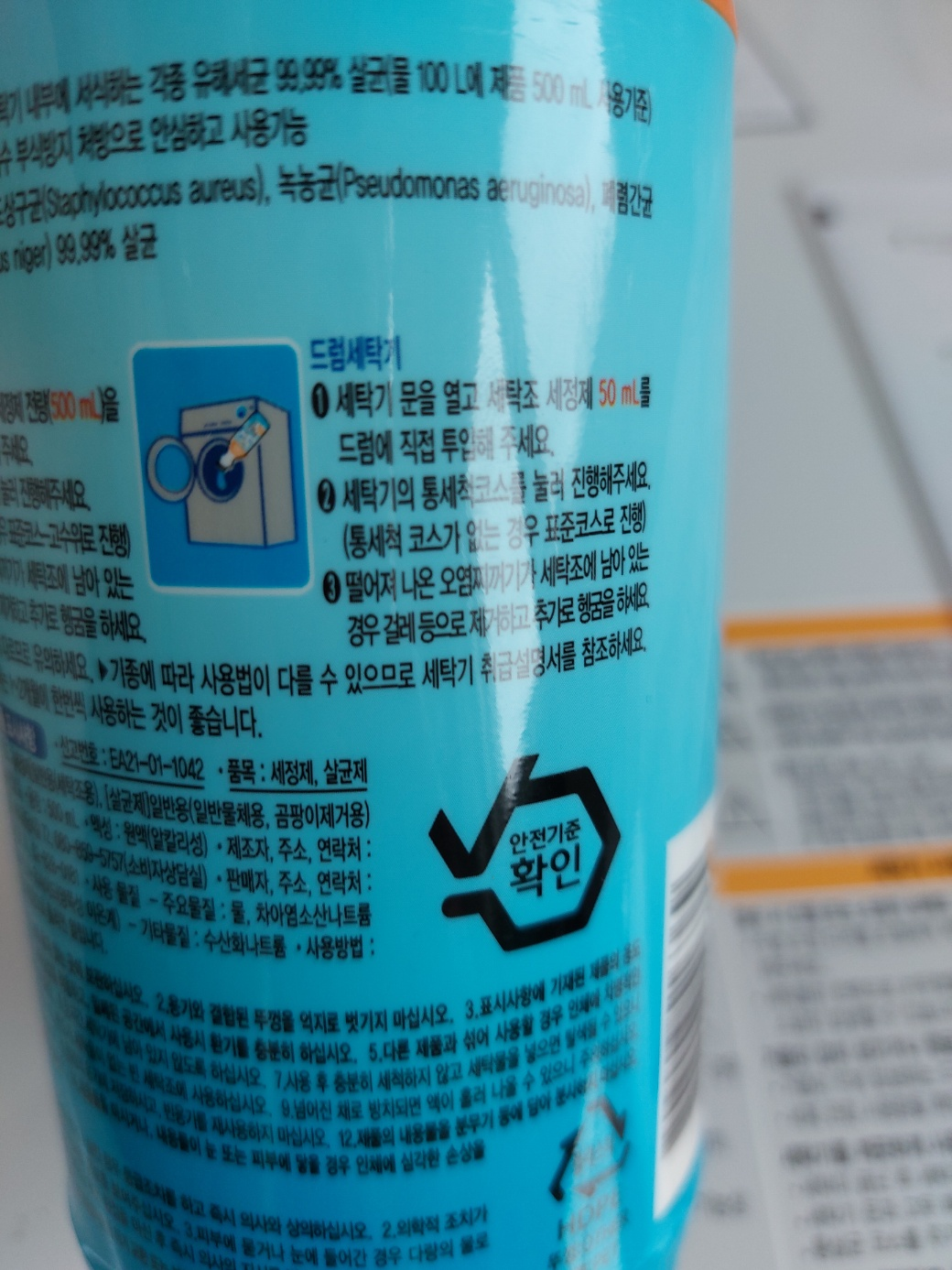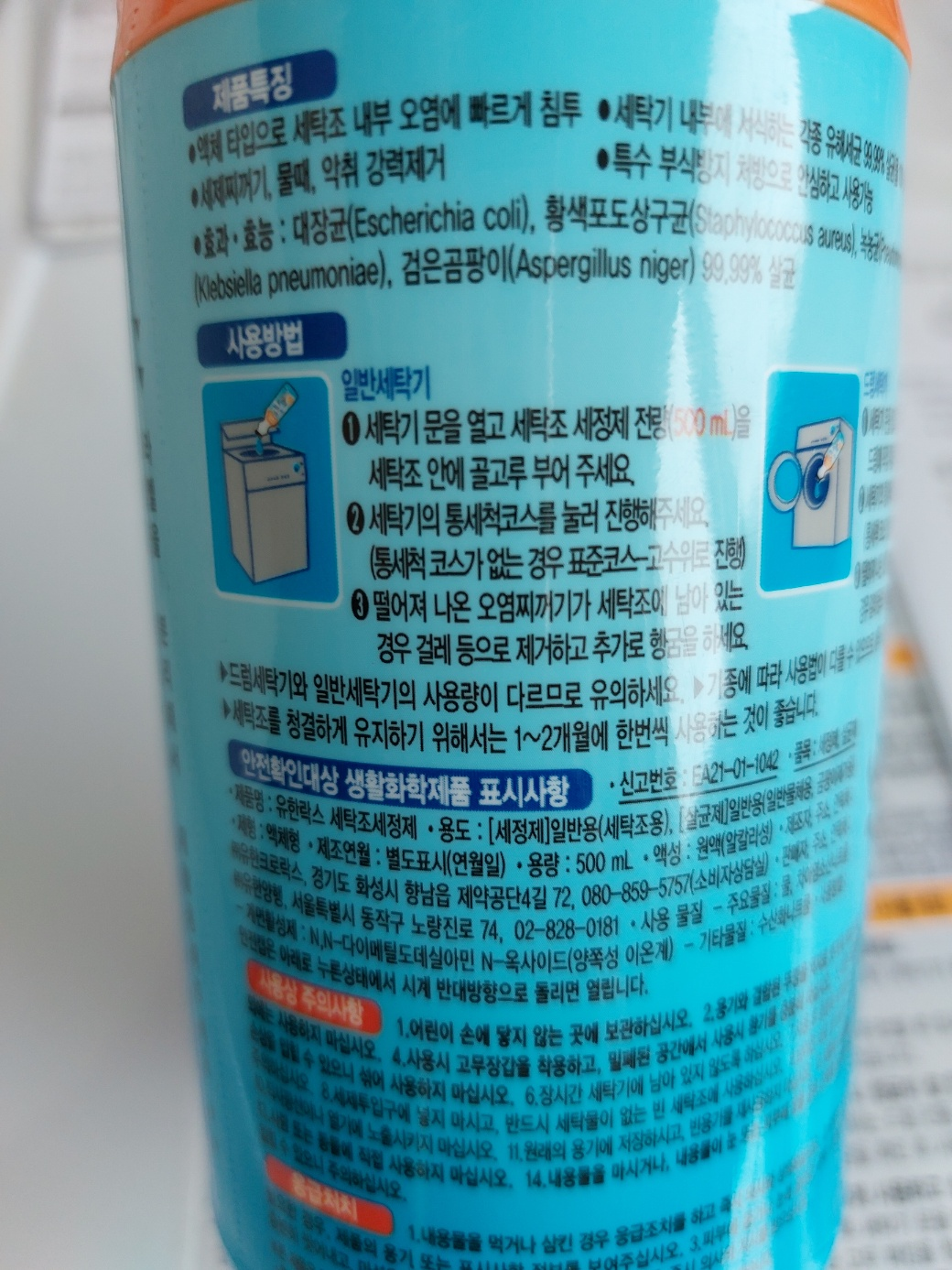 최근에 이사하고 세탁기를 새로 구매하면서 설치기사분께 세탁조 클리너(세정제)를 한달마다 사용하라는 추천을 받았습니다. 그동안 수천번 세탁기를 돌려봤지만, 세탁조 클리너가 있다는 건 처음 알았습니다. 락스로 유명한 유한락스에서 세탁조 클리너를 판매하길래 믿고 구매했습니다. 작은 락스통과 비슷하게 생겼는데, 컬러가 주황색으로 눈에 띕니다.