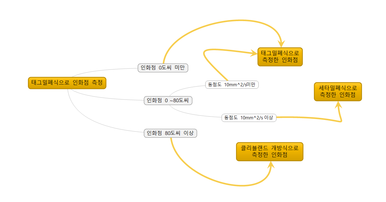 인화점 시험방법을 간단하게 표현하면 위 그림과 같다. 처음에는 태그밀폐식으로 시험을 해서 인화점을 대략적으로 파악한다. 이때 인화점이 0℃ 미만인 경우에는 태그밀폐식으로 측정한 인화점을 해당 물질의 인화점으로 정한다.