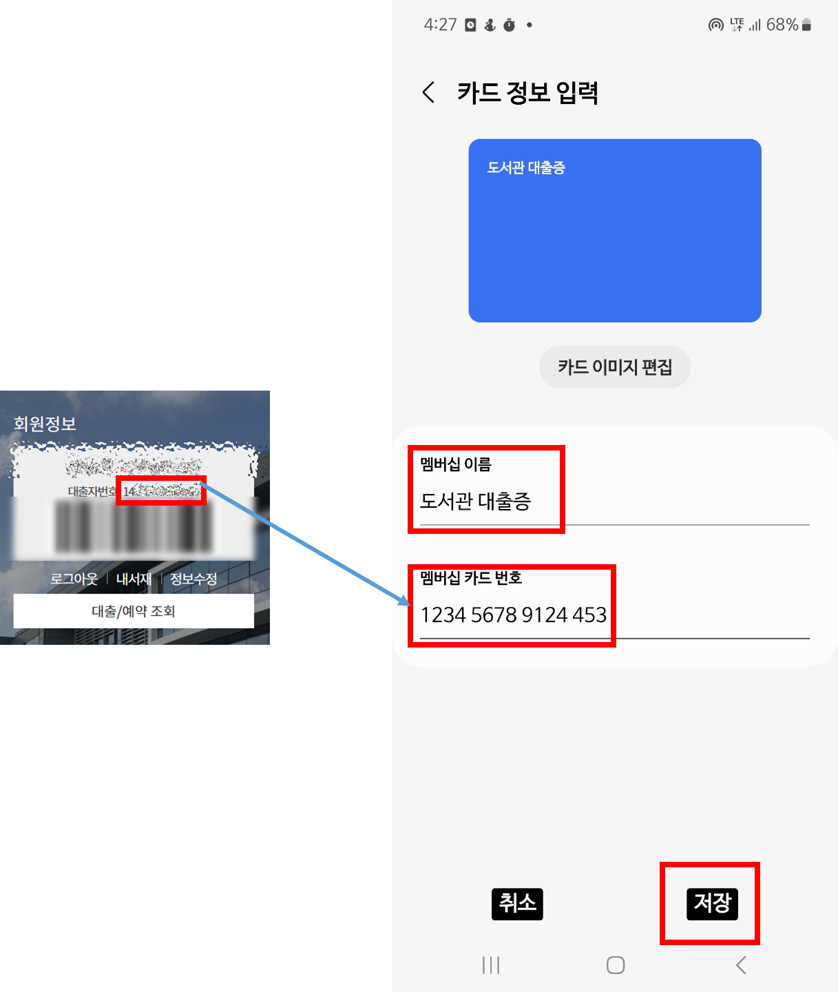 4. 카드이름 및 카드번호 입력 후 저장을 클릭합니다. 멤버십 이름은 원하시는 대로 입력하시면 되고, 멤버십 카드 번호에 도서관 회원증 바코드에 있는 번호를 입력해주시면 됩니다. 회원증 번호를 잘못입력하면 삼성페이로 인식이 안되니 정확하게 입력하시면 됩니다.