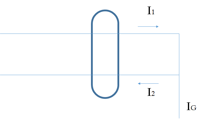 | - 전류 누설시 키르히호프 제1법칙에 의해 $I_1$ = $I_2 + I_G$ 들어오고 나가는 전류의 양이 달라지므로 영상변류기에 자속이 생성되며 이로 인해 생긴 자속변화가 감지부 쪽에 전류를 생성하여 누설을 감지(경보 발생) |