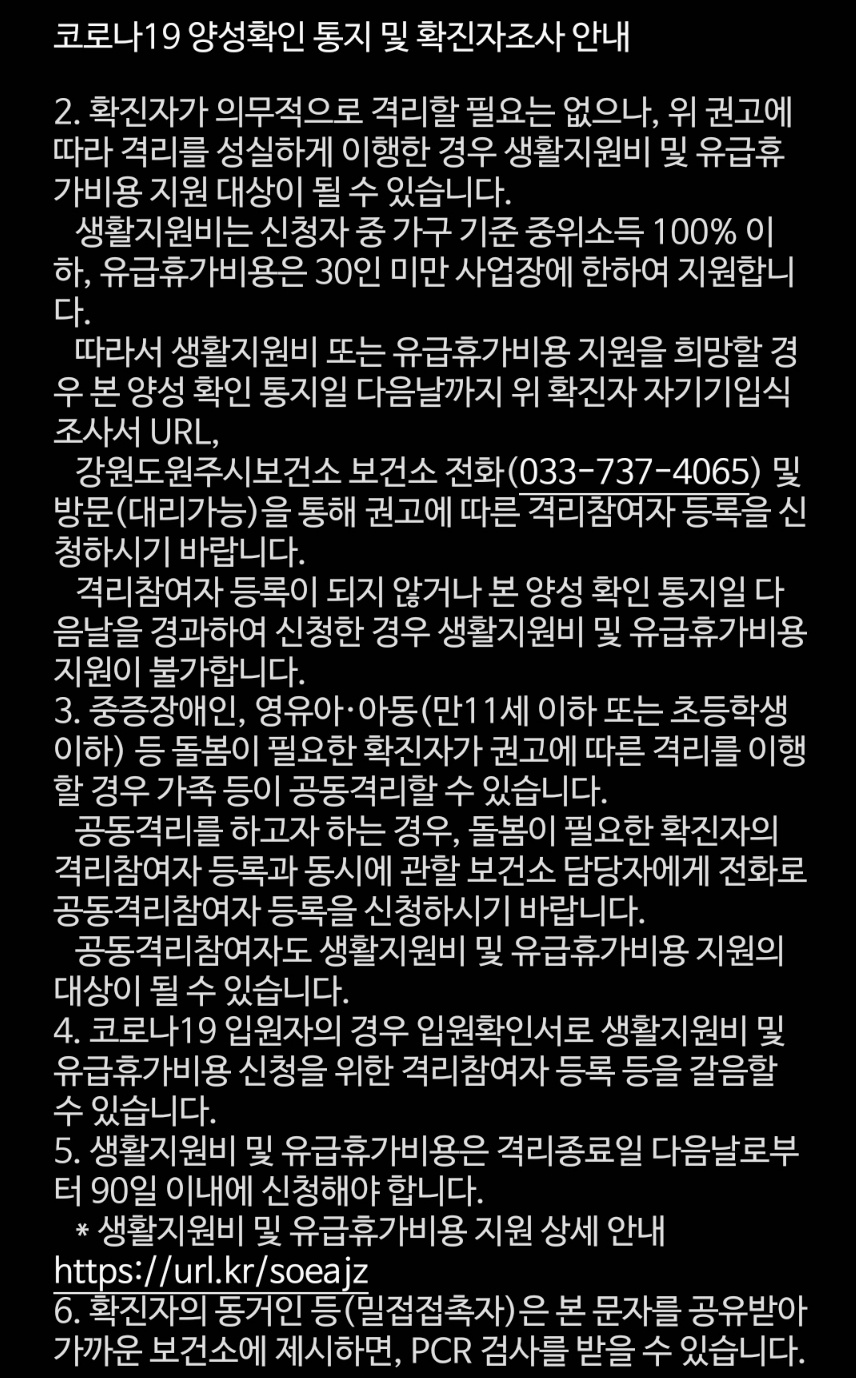 2023년 6월 1일자로 5일 자가격리는 권고사항으로 바뀌었다. 코로나 확진을 받아도 5일 자가격리는 본인이 근무하는 회사 혹은 사업체가 정한대로 따라야 한다. 코로나 확진을 받아도 어느 회사에 근무하냐에 따라 자가격리가 없이 출근해야 한다는 뜻이다. 그리고 자가격리로 인한 생활지원비는 중위소득 100% 이하인 경우에만 수령할 수 있다. 자세한 사항은 아래 문자 내용을 확인하면 된다.