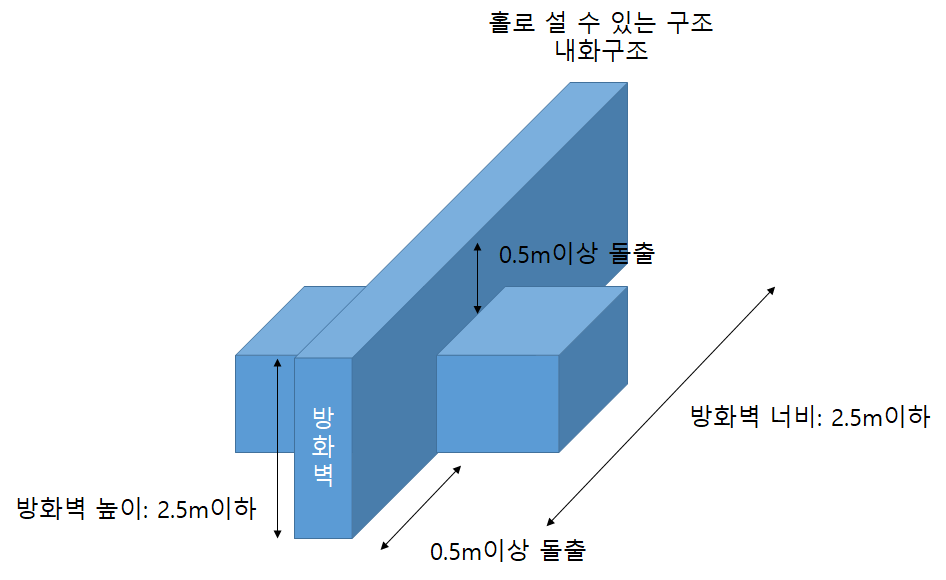 - 방화벽의 양쪽 끝과 윗쪽 끝을 건축물의 외벽면 및 지붕면으로부터 0.5m이상 돌출