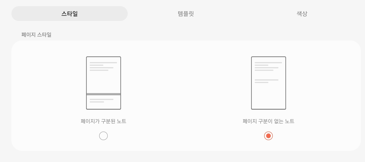 하지만 여기서 한가지 문제가 생긴다. 다른 이들에게는 큰 문제가 아닐 수 있지만 나와 같은 고민을 하고 있을 사람이 분명 있을거라 생각한다. 바로 삼성노트 페이지 스타일이다. 페이지 스타일에는 크게 2가지가 있다. 페이지가 구분된 노트, 페이지 구분이 없는 노트이다. 페이지 구분이 없는 노트는 말 그대로 페이지 구분이 없어 긴 사진을 캡쳐해서 삼성노트에 업로드하기가 좋다. 반면 페이지가 구분된 노트는 A4크기의 용지를 스캔해서 삼성노트에 업로드할 때 좋다.