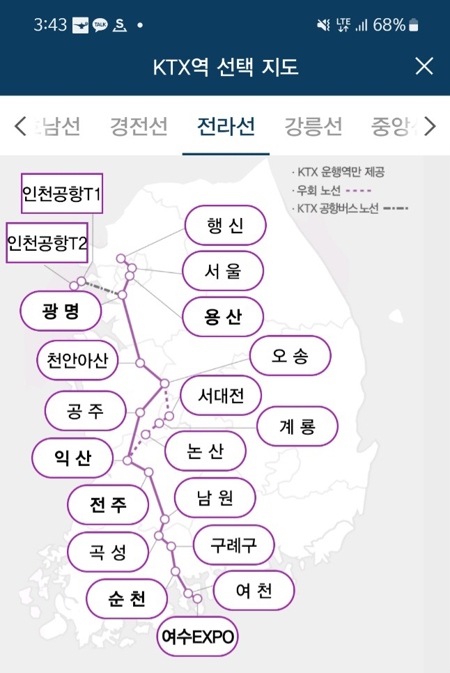 KTX: 행신 - 서울 - 용산 - 광명 - 천안아산 - 오송 - 공주 - 익산 - 전주 - 남원 - 곡성 - 구례구 - 순천 - 여천 - 여수EXPO