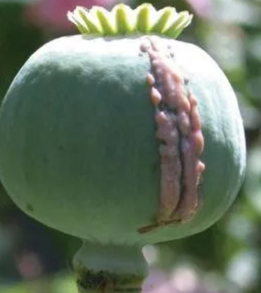 아편의 원료인 모르핀은 양귀비 씨앗에서 채취할 수 있습니다. 양귀비 씨앗을 터트리면 위와 같이 끈적한 액이 나오게 되는 데 저게 모르핀입니다. 모르핀이라는 성분만 들어있는 것은 아니지만 모르핀이 대표적인 물질이라고 보시면 됩니다.