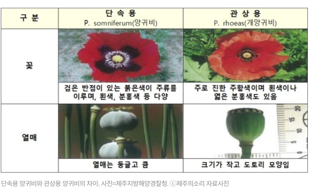 | 구분 | 마약 양귀비 | 꽃양귀비(개양귀비) |