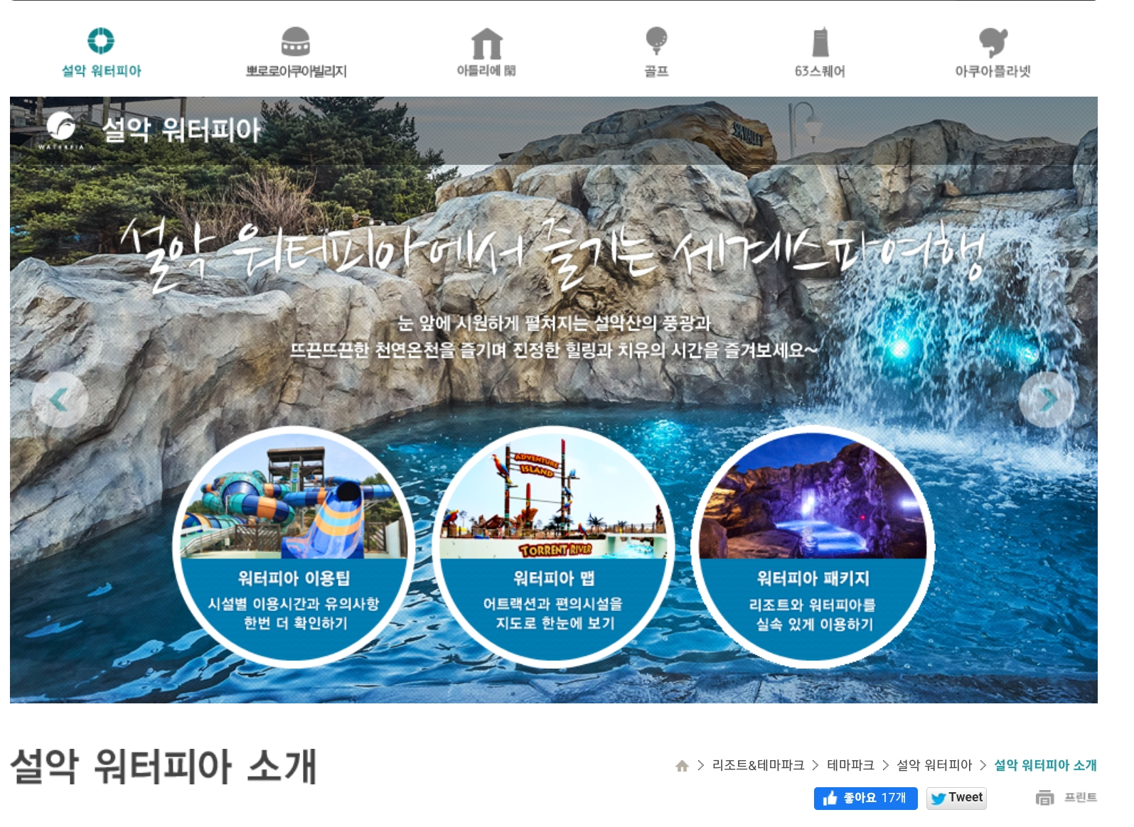 한화리조트에서는 워터피아라는 워터파크가 있습니다. 캐리비안 베이, 홍천 비발디 파크만큼 크지는 않지만 속초에서 즐길 수 있는 워터파크라 의미가 있습니다. 제 친구가 다녀왔다는 데 생각보다 꽤 괜찮은 워터파크라고 하더군요. 특히 겨울에 가면 정말 사람이 없어서 큰 놀이기구를 계속 탔다고 합니다.