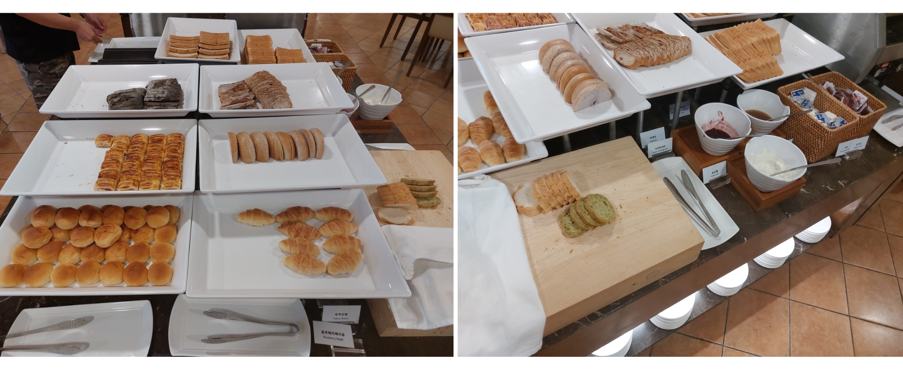 기본적인 빵이 있습니다. 모닝빵, 베이글, 크로아상, 식빵 그리고 빵에 발라먹을 수 있는 사과잼, 포도잼, 크림치즈, 딸기잼 버터가 있습니다.