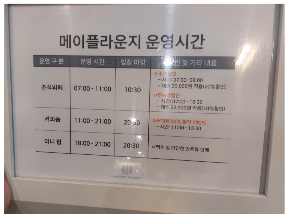 참고로 한화리조트 별관에도 조식이 있습니다. 쏘라노보다 가격이 6,000원 저렴합니다. 그대신 메뉴 종류가 조금 적습니다. 공간도 조금 작구요. 그만큼 저렴하다는 게 장점입니다.