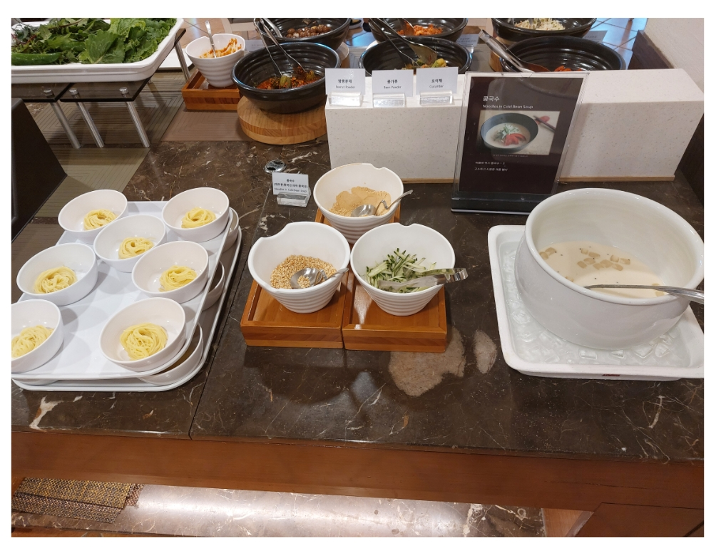 메인디쉬와 함께 곁들여 먹을 수 있는 국, 그리고 계절메뉴인 콩국수가 있습니다. 콩국수는 시원하고 고소했습니다. 저는 콩나물국이 아주 시원해서 좋더라구요.