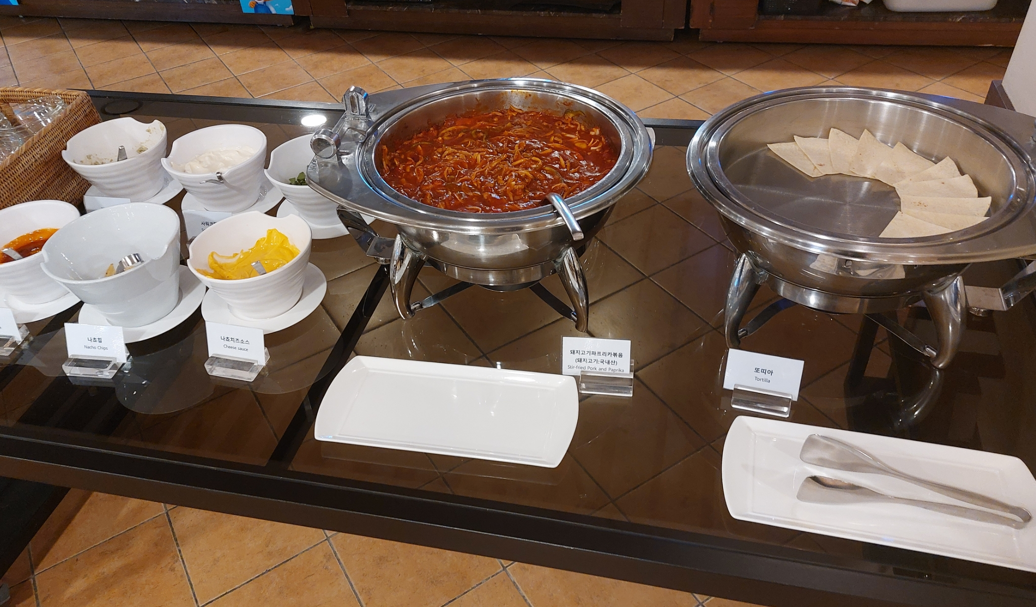 메인디쉬는 8종류가 있습니다. 베이컨, 소세지, 닭강정 등 고기류가 대부분이었습니다. 훈제 연어가 있어서 아주 많이 먹었습니다. 훈제 연어 위에 북경식 오리고기?라는 게 있었는데 차가워서 저는 별로였습니다.