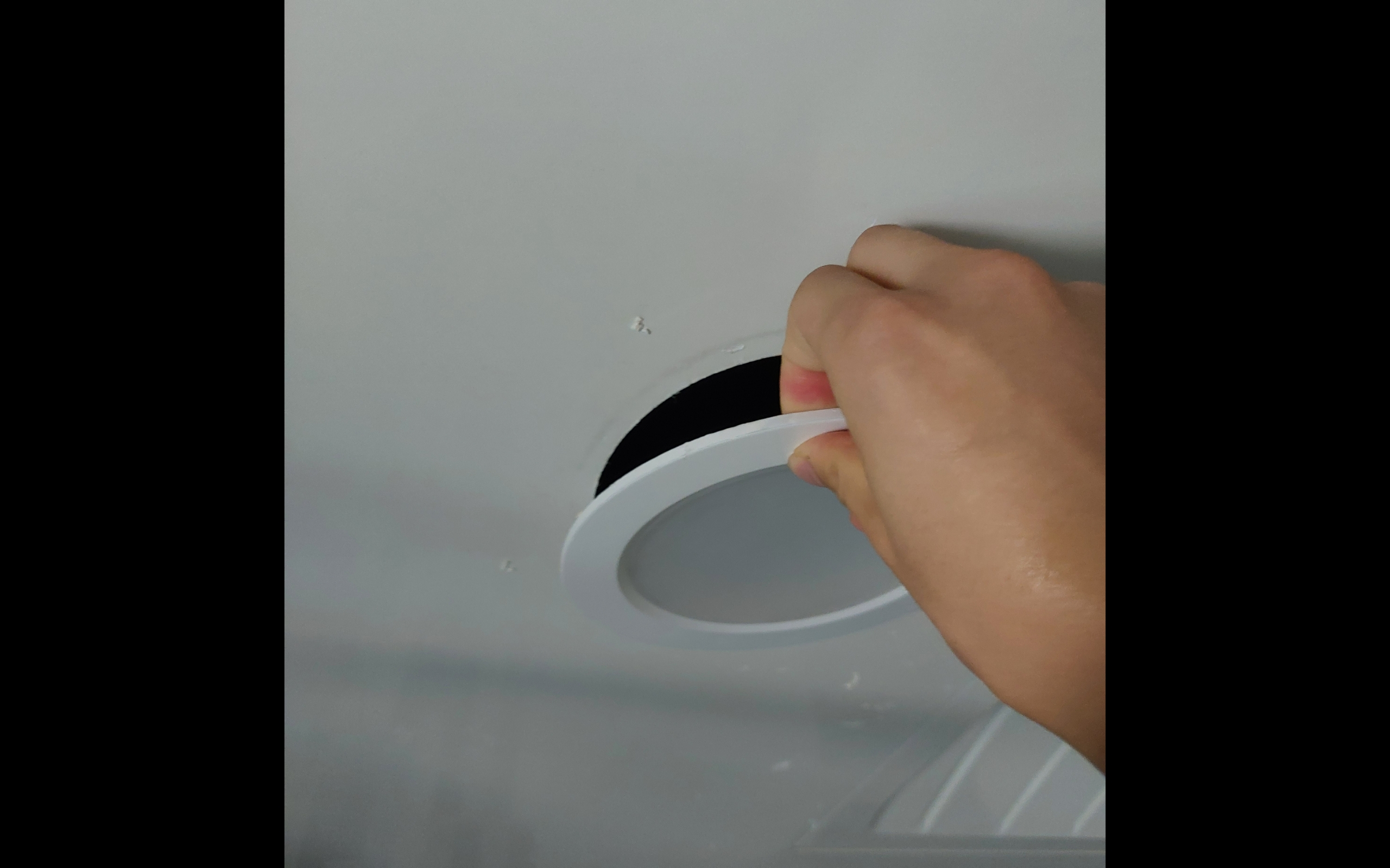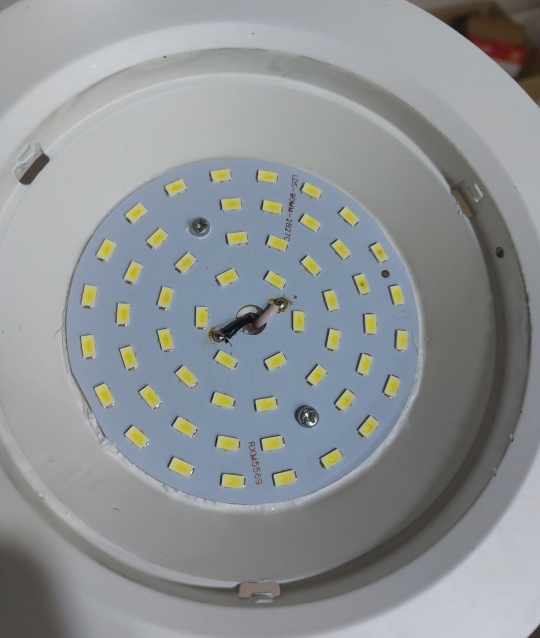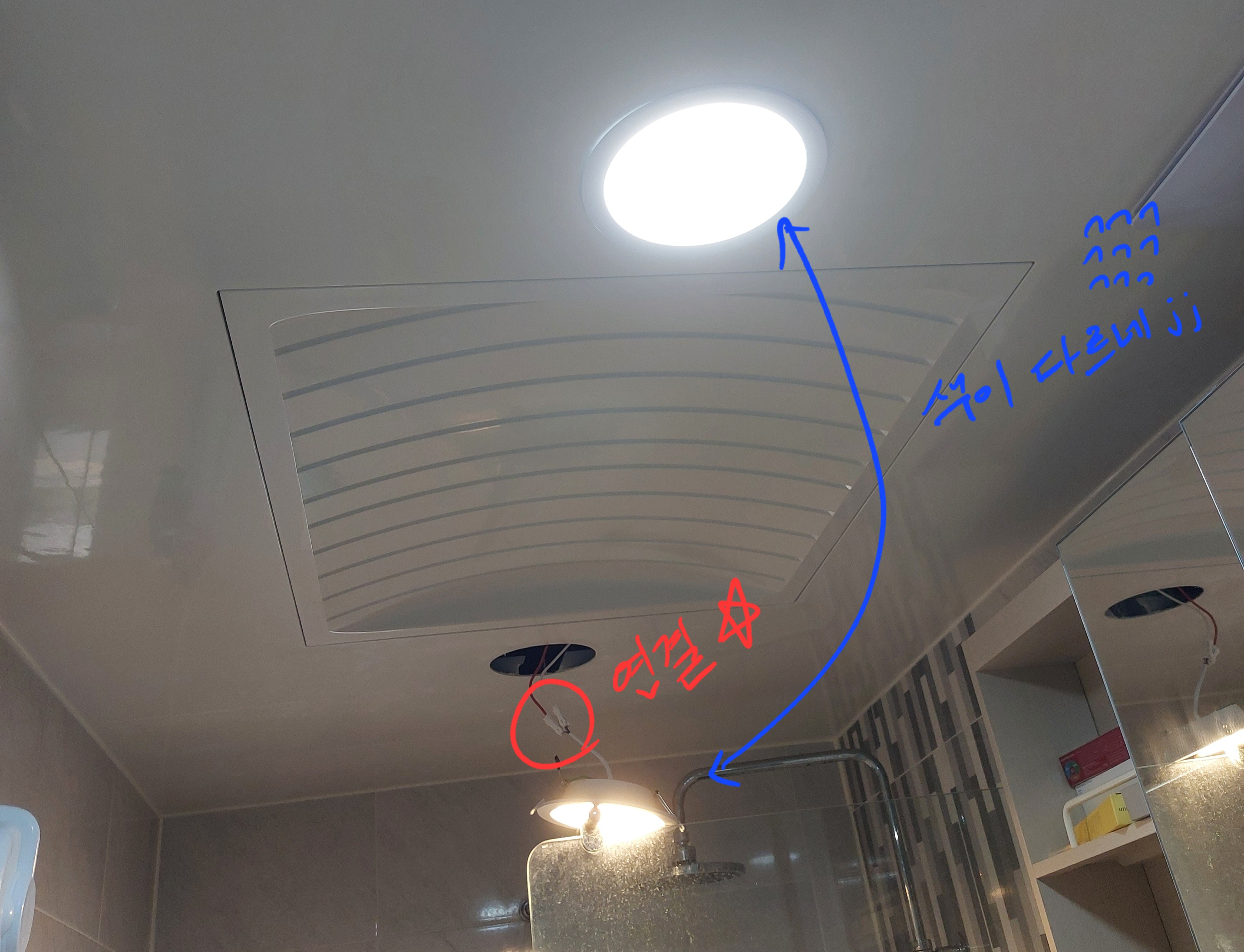 2. 전기를 차단했으면 이제 욕실 천장에 있는 전등을 빼준다. 이런 원형 LED 등은 반자의 얇은 두께에 스프링으로 고정하기 때문에 그냥 당기면 되는데, 반드시 스프링 없는 부분을 잡고 당겨야 한다. (스프링 펴지면서 손가락 맞으면 멍든다..)
