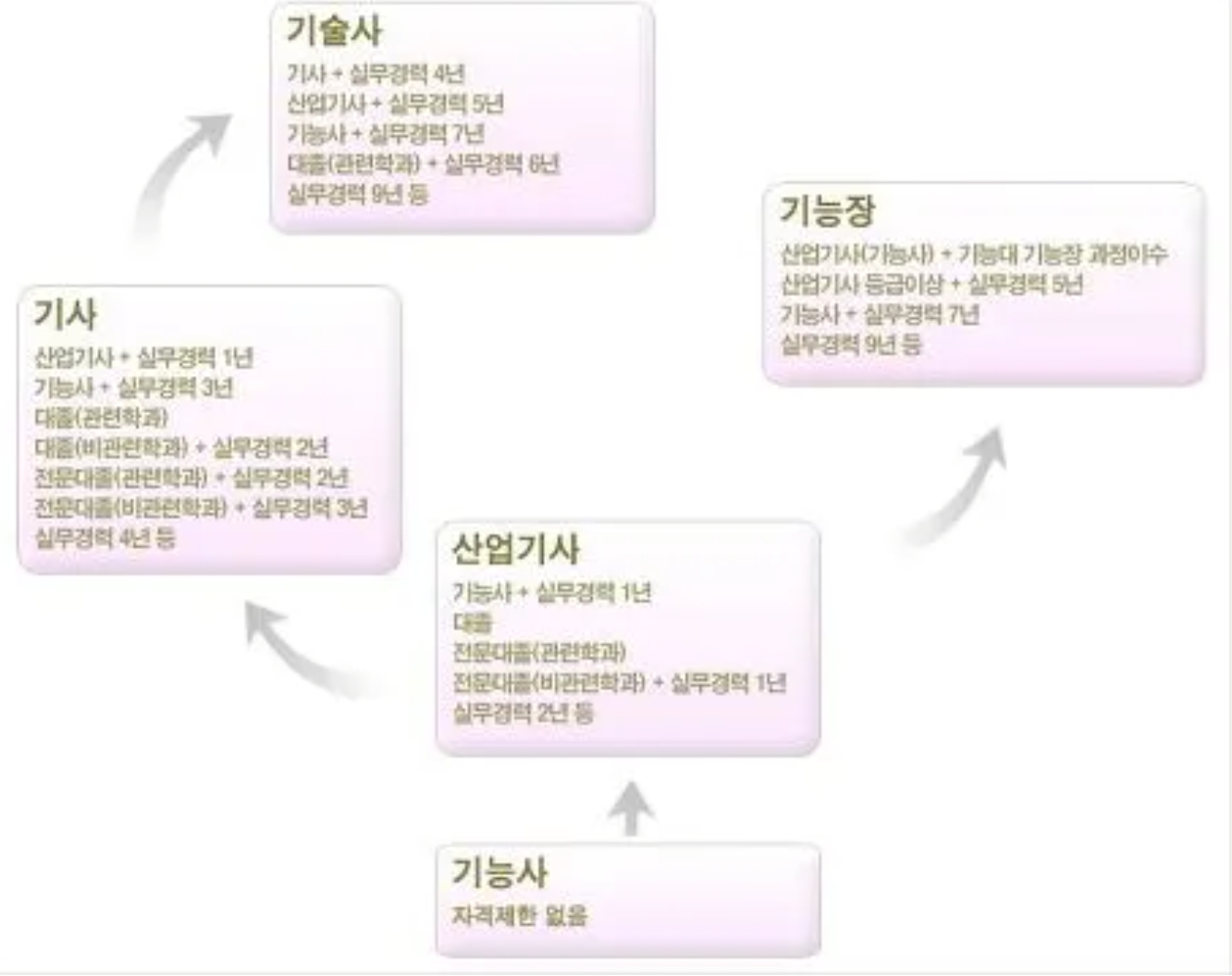 고등학교 졸업 후 일한지 얼마 되지 않았다. > 기능사 자격부터 시작하거나 경력을 2년 쌓고 좀 더 공부해서 산업기사부터 취득하는 게 유리함