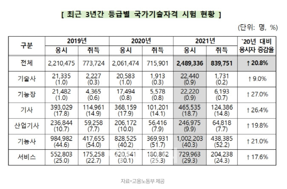 국가기술자격증의 응시자수가 해가 갈수록 많아지고 있다. (2020년도 응시자가 줄어든 건 코로나 영향) 사람들이 자격증에 관심을 점점 갖기 시작했다는 건 삶이 팍팍해졌다는 뜻이다. 지금 다니고 있는 직장, 하고 있는 일로 먹고 살기가 시원찮으니 다른 일을 알아보는 것인데, 재취업을 하기에는 힘드니 자격증을 통해 밥벌이를 해보려는 것이다.
