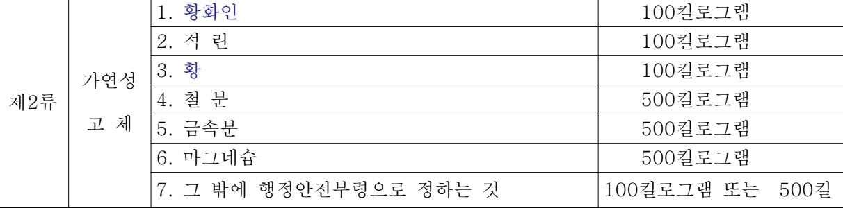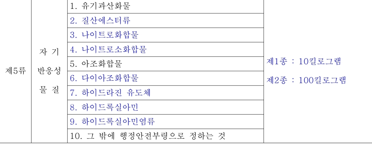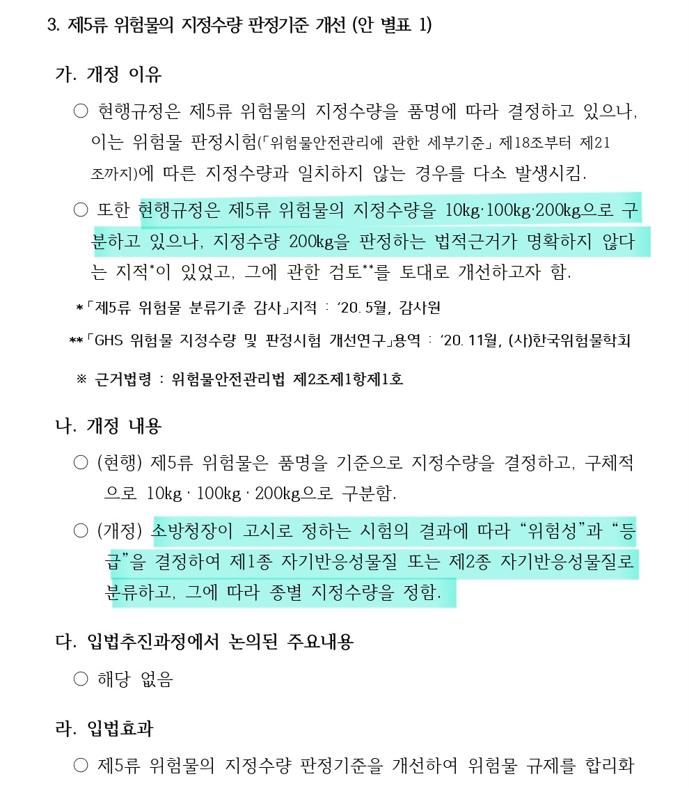 각 개별 물질의 위험성을 평가하여 지정수량을 정하는 방식이 된 것 같습니다. 기존에는 200kg의 지정수량으로 위험물안전관리법의 영향을 받던 물질이 이번 개정으로 지정수량 제한이 없는 물질이 될 수 있는 것이죠.