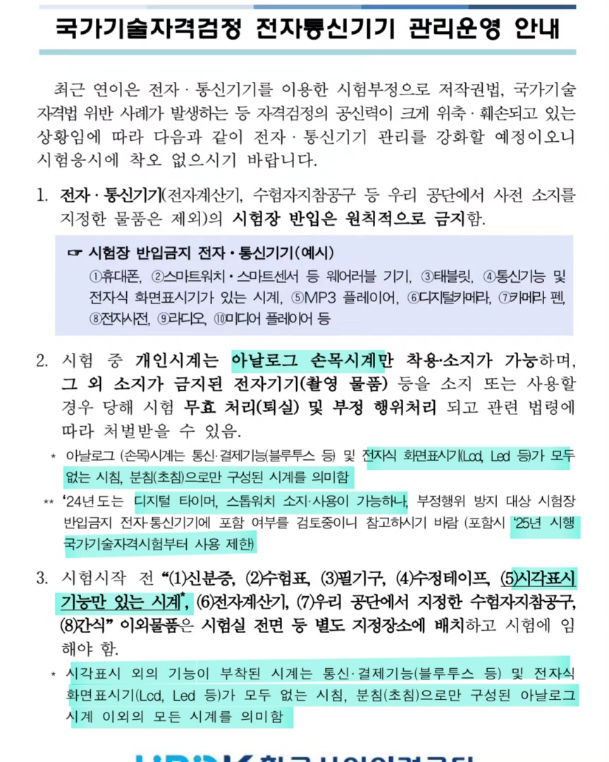 대신 유예기간이라 해서 스톱워치, 디지털 타이머는 허용한다고 합니다. 다만, 25년부터는 디지털 타이머도 금지가 될 수 있습니다. 그래서 올해부터 아날로그 시계 준비하셔서 시험장에 가시는 게 좋을 것 같습니다.