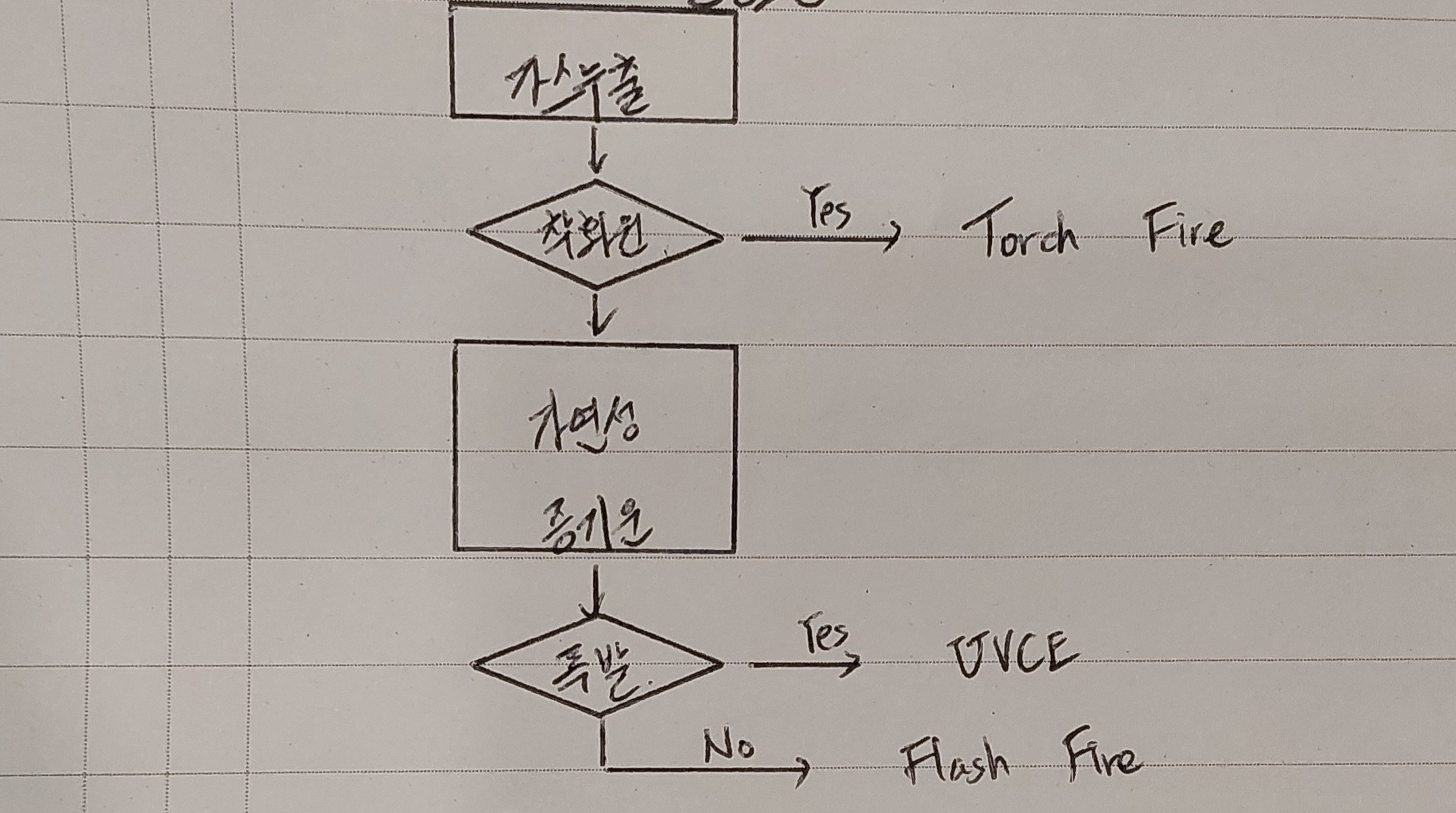 가연성가스 누출 ↓ 누설 가스 확산 ↓ 공기와 혼합기 형성 ↓ 점화원에 의한 연소 |