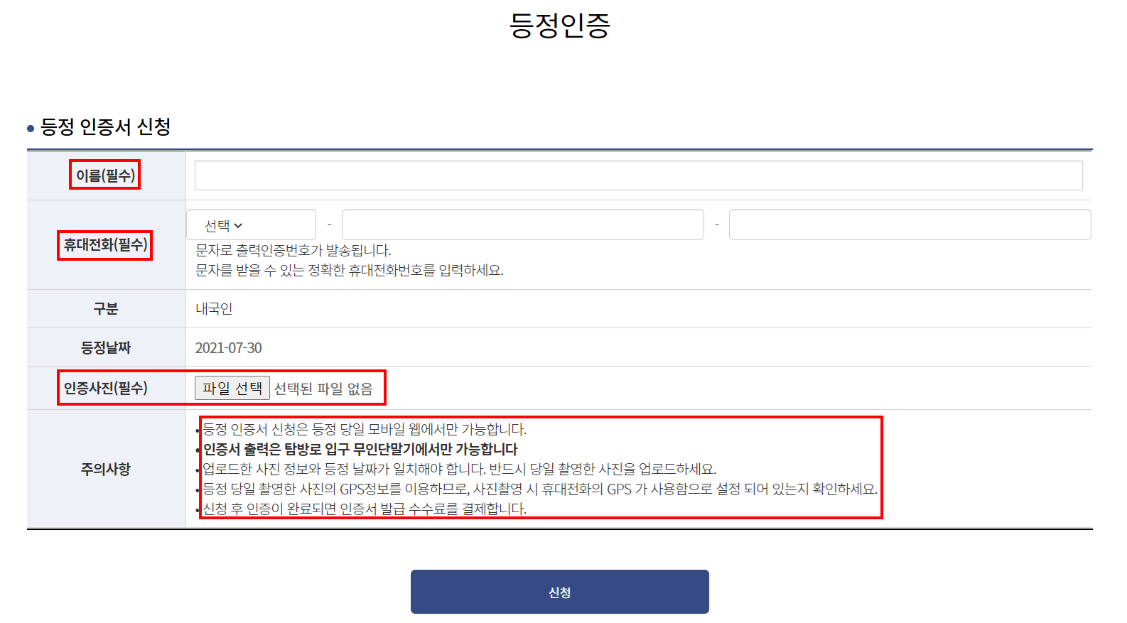 본인 정보를 입력하고, 사진을 첨부한 후 신청버튼을 누르면