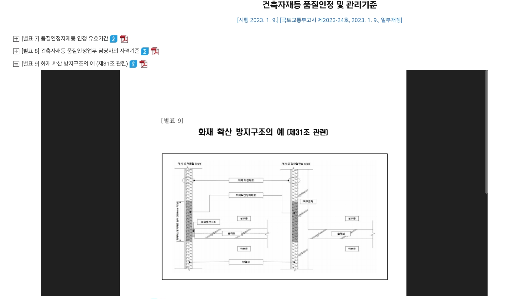 1) 수직 화재확산 방지를 위하여 외벽마감재 사이에 매층마다 최소 400mm이상 특정 재료를 밀실하게 채운 것