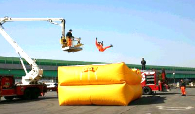 공기안전매트란 화재 시 사람이 건축물 내에서 외부로 긴급히 뛰어내릴 때 충격을 흡수하여 안전하게 지상에 도달할 수 있도록 포지에 공기 등을 주입하는 구조로 되어 있는 것을 말함
