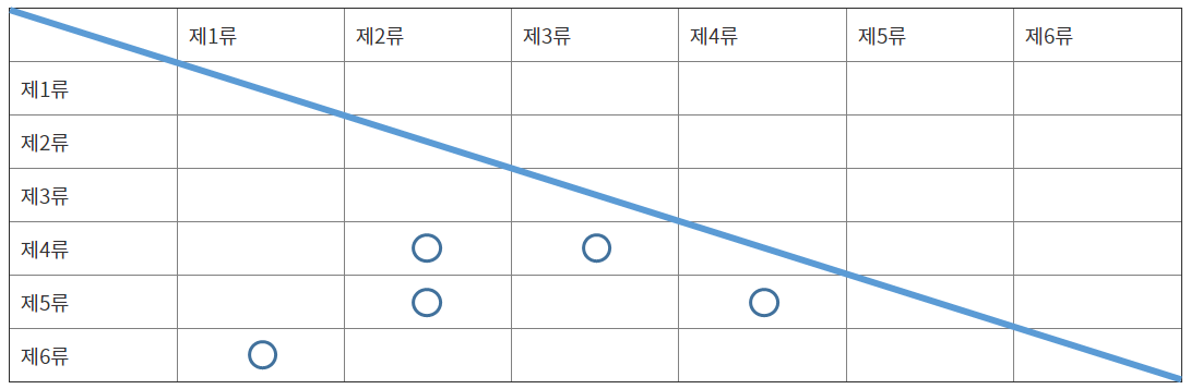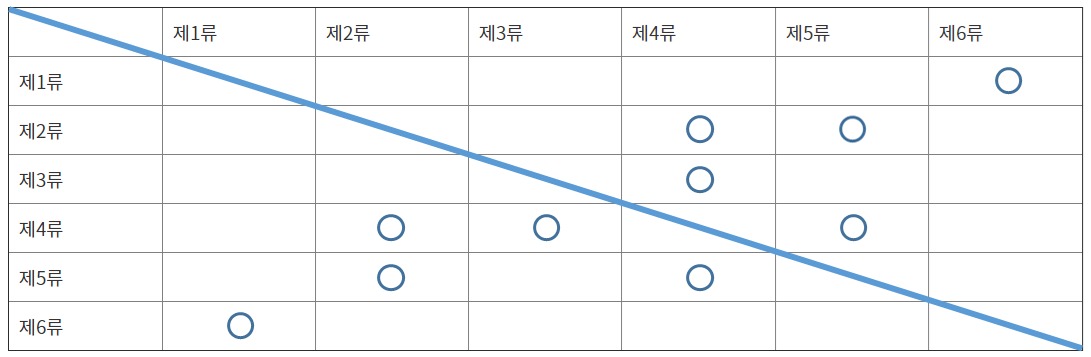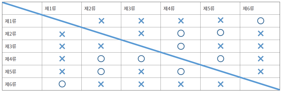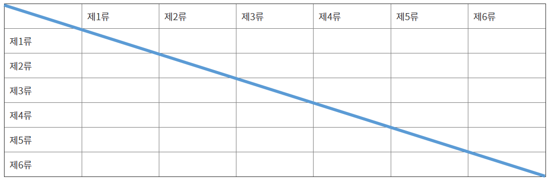 2. 가로 및 세로 축에 제1류 ~ 제6류를 적는다