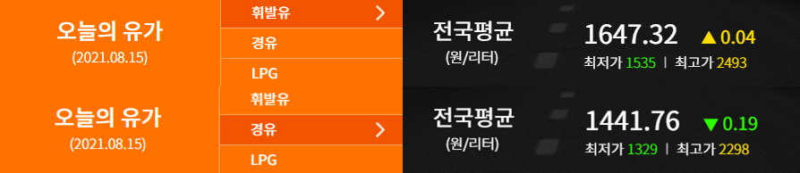 연료가격 기준은 2021.08.15 (출처: 한국석유공사 오피넷)
