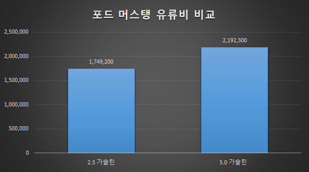 포드의 머스탱 자동차는 스포츠카이다. 고성능 차량이기 때문에 연비가 나쁘다. 5.0 가솔린은 2.3가솔린보다 배기량이 2배 이상 많기 때문에, 자동차세도 많이 부과될 것이다.