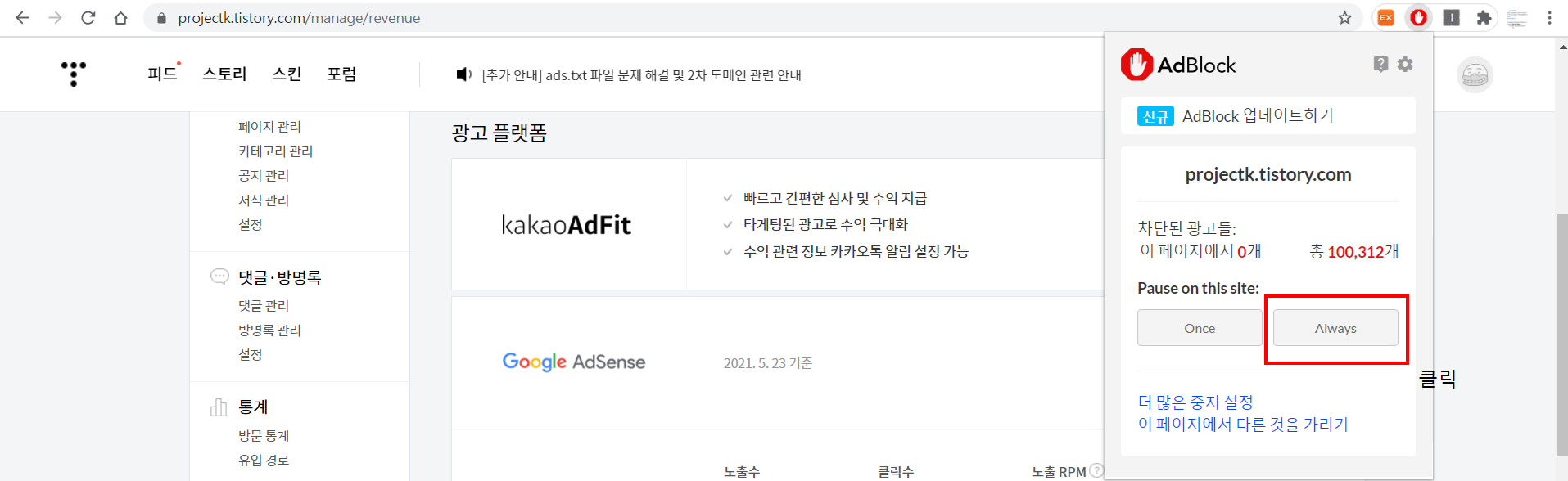 2) 팝업창에서 Pause on this site(현재페이지에서 광고차단을 중지할거냐)라는 물음에 'Always'를 클릭한다.