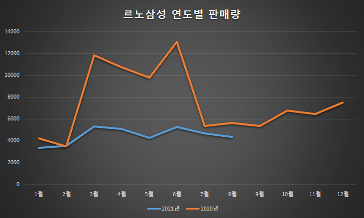 2020년에 비해 부진한 판매성적을 이어가고 있다. 르노삼성도 시대의 흐름에 발맞춰 친환경 차량을 출시해야 하지 않을까 싶다. 최근에는 르노 브랜드도 국내에 자동차를 출시하고 있어, 이대로 가다간 위험하지 않을까 생각한다.