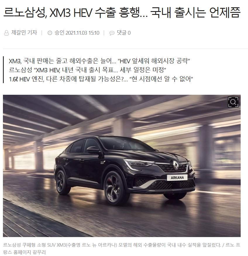 현재 르노삼성에서는 XM3 하이브리드를 아르카나라는 이름으로 수출하고 있습니다. 하지만 국내에는 정식 출시하지 않아 XM3 하이브리드를 구매할 수 없습니다.