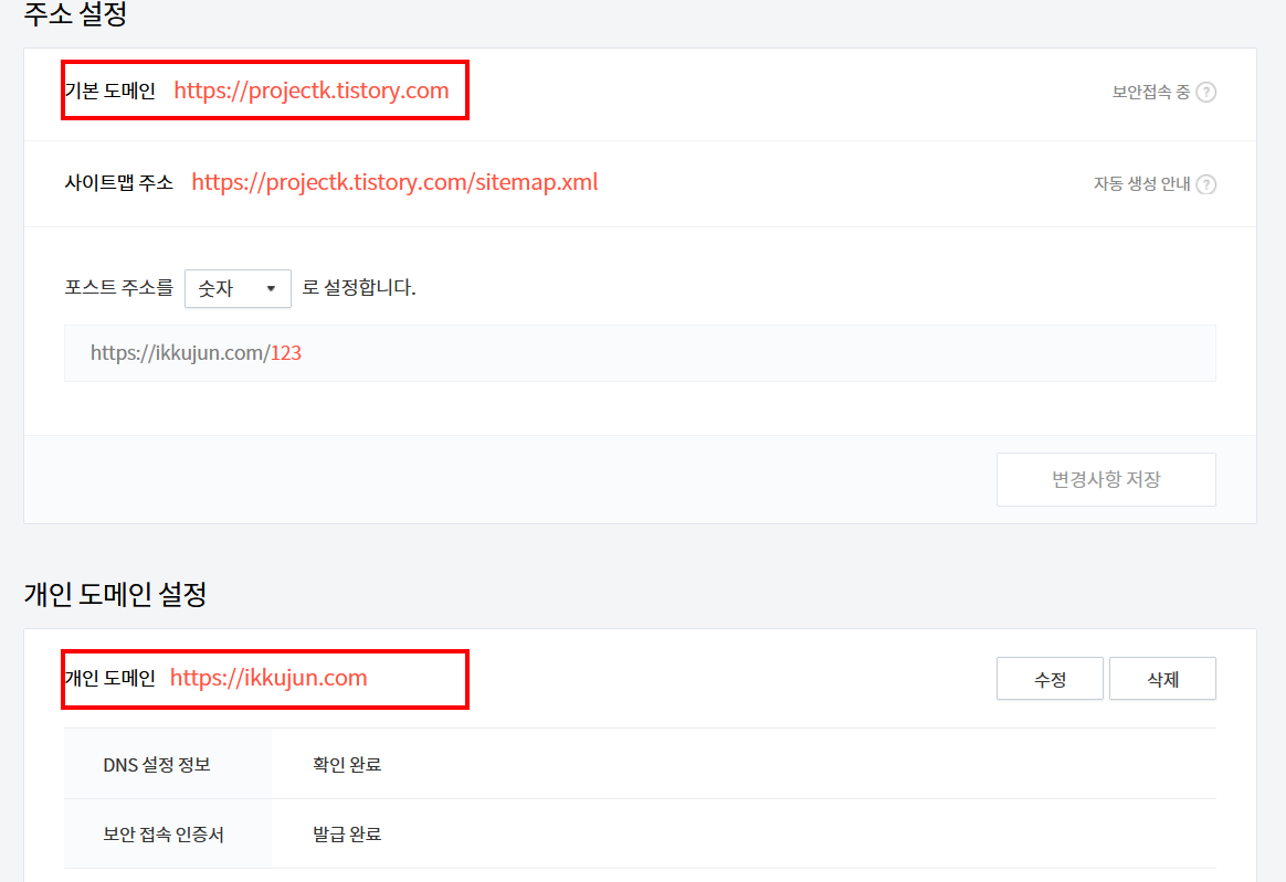 도메인 설정해보는 게 처음이라 좀 시행착오가 있었지만 어찌어찌 잘 되었습니다. 다음에는 개인 도메인 연동하는 방법도 포스팅해보겠습니다. 참고로 저는 호스팅케이알 업체를 이용하였습니다.