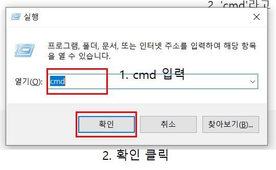 2. 'cmd'라고 입력후 확인을 클릭