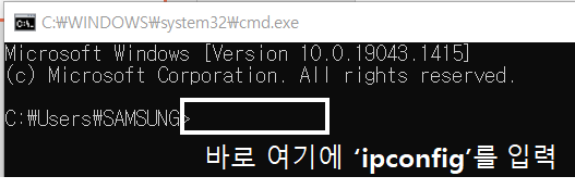 4. 깜빡이는 커서 부분에 'ipconfig'를 입력후 엔터를 누르시면 됩니다.